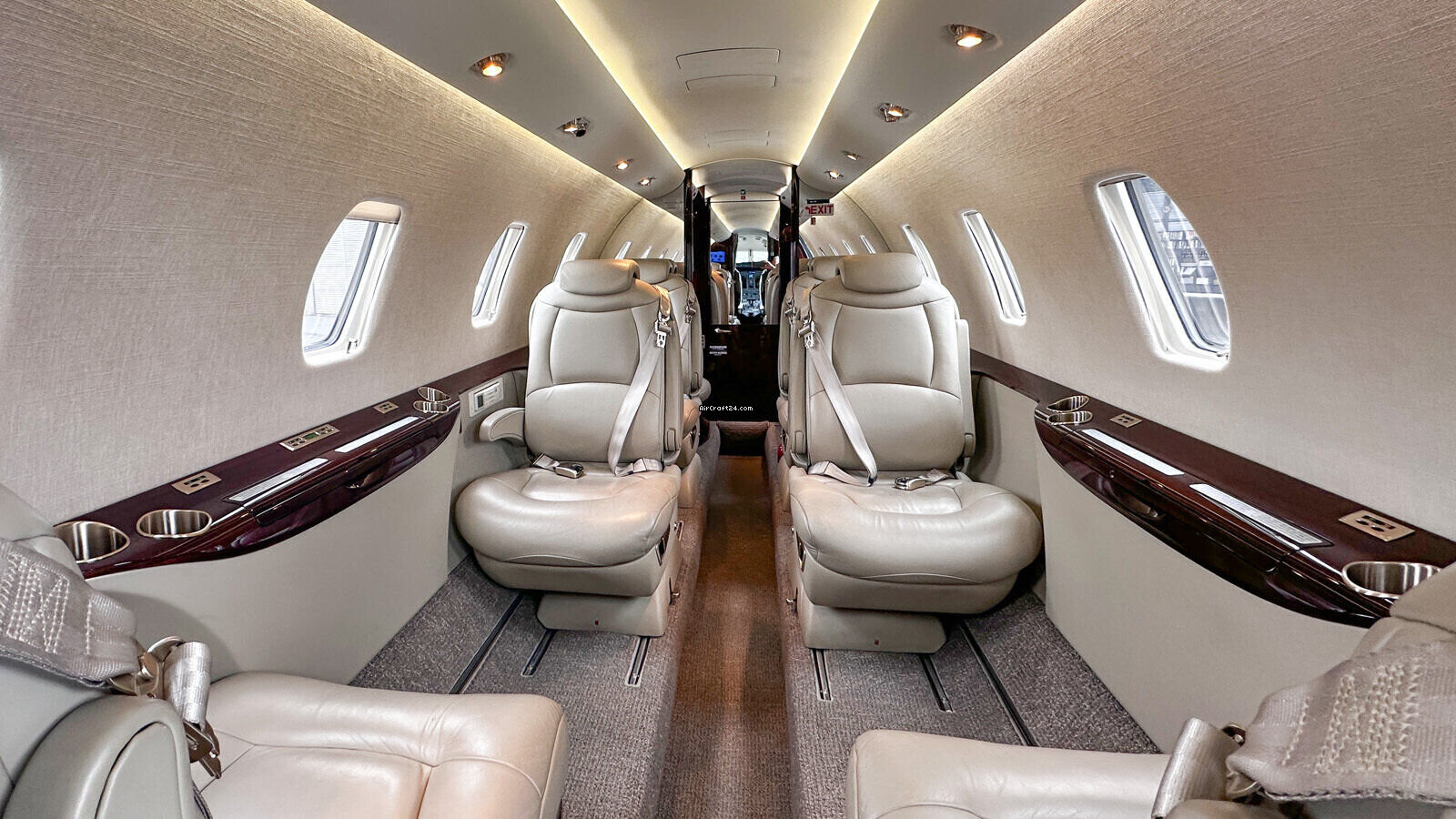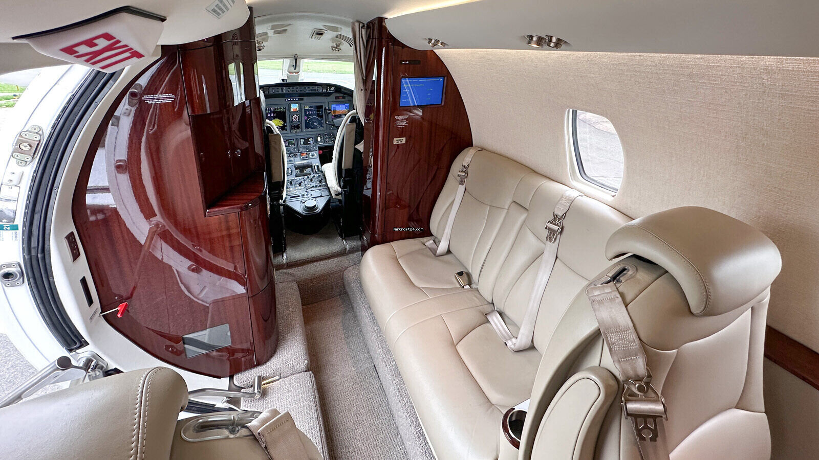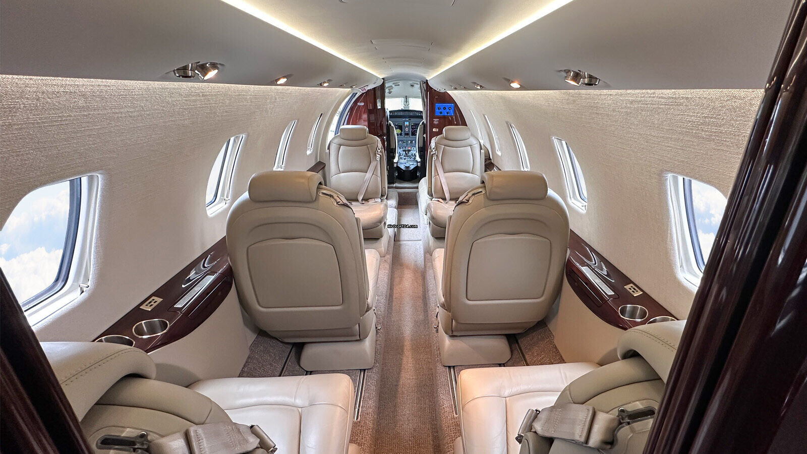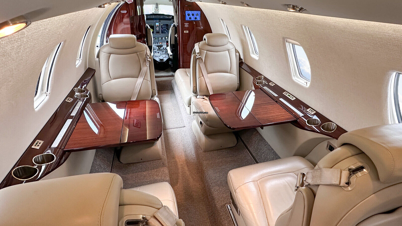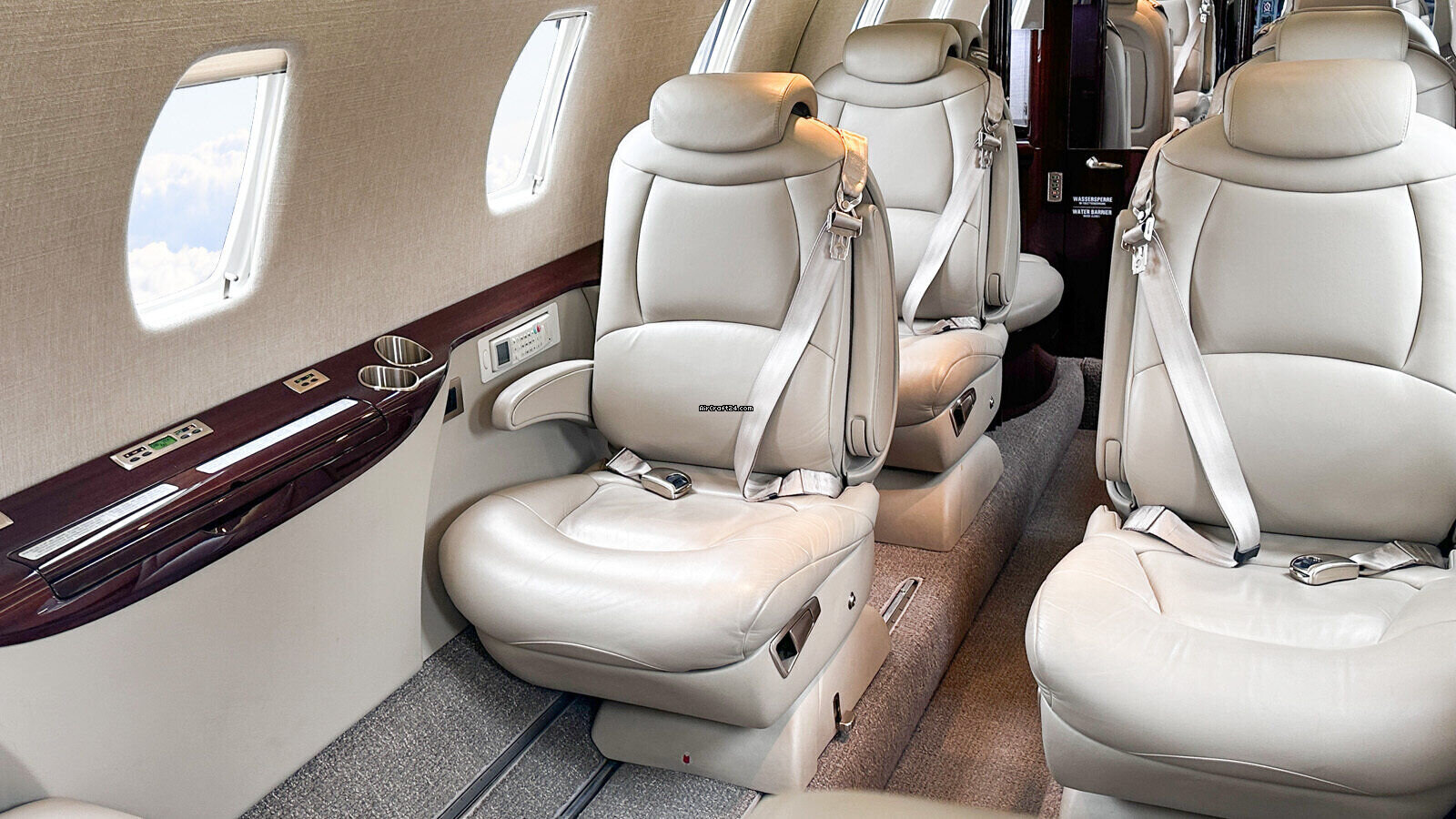 Interior | 8+1 Cabin Seat Configuration, 4 Club Seats; 2 single fwd. Seats, double seat Couch and belted Toilet Seat, Cabin and Cockpit AC Power Outlets (115V), Lavatory with Sink and sliding door for privacy, 2 additional foldable Pax Tables on seat 7 & 8, Satcom (Aircell), AXXII WIFI (GoGo), ATG 4000 Broadband, 10.4” LCD Airshow, Hot Coffee Pot, RosenView Cabin Briefer |