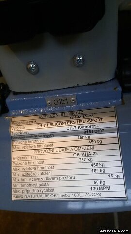 | Base data | | Type: | Helikopter (Piston) | | Producent: | CH-7 | | Model: | CH-7 Kompress | | Bouwjaar: | 2007 | | Serial No.: | 0151 | | Attributes: | Always hangared | | Location: | Duitsland | | Total Time (TTAF): | 120 h | | Prijs: | € 65.000 | | No. of passengers: | 2 |
