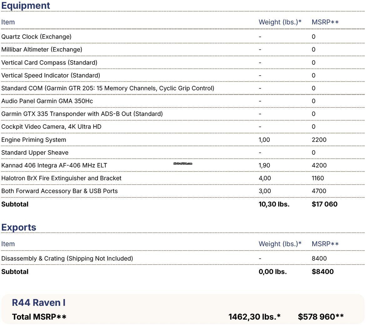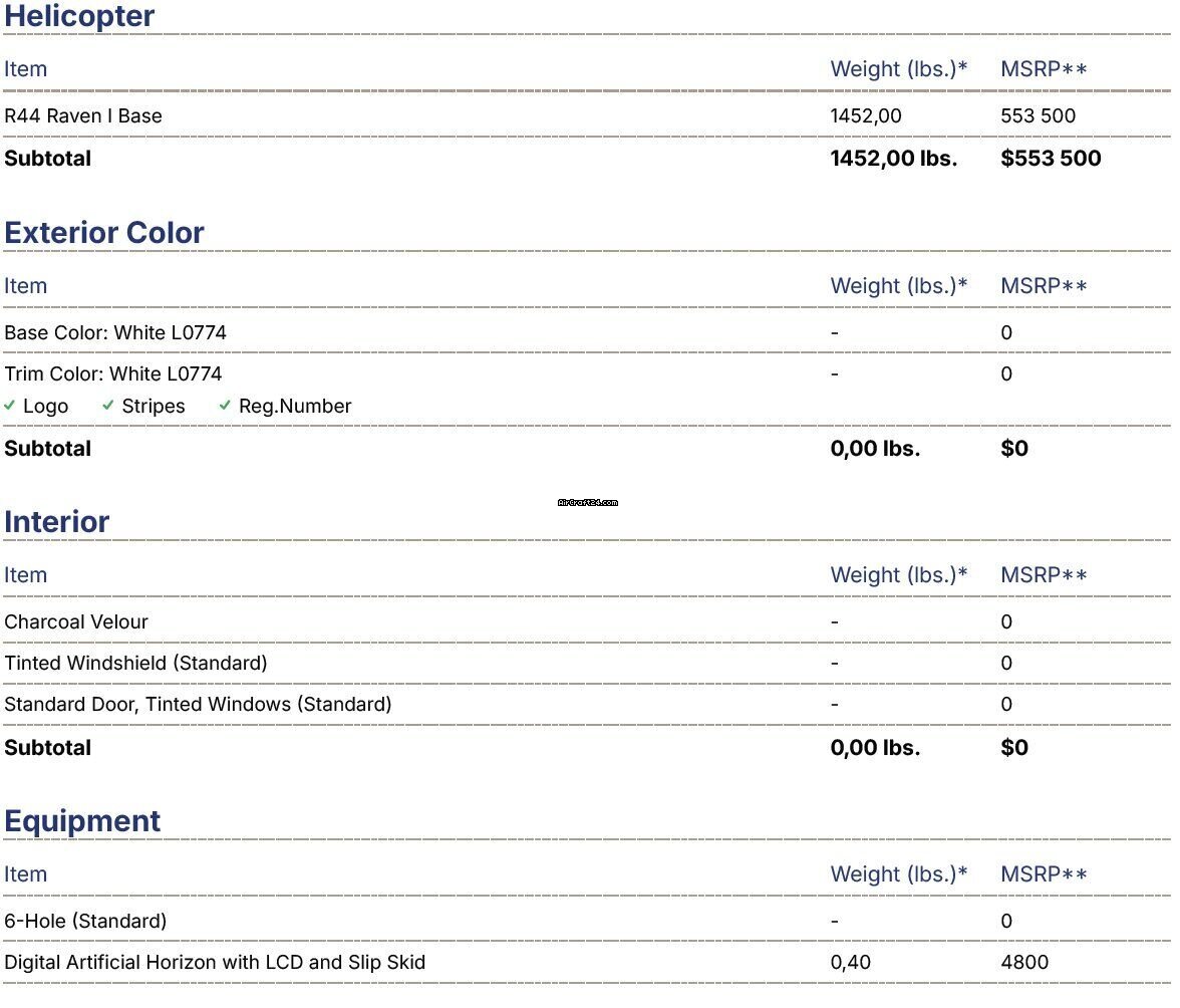 | Base data | | Type: | Helikopter (Piston) | | Producent: | Robinson | | Model: | R44 | | Bouwjaar: | 2023 | | Registration No.: | SP-SOW | | Serial No.: | 2766 | | Location: | Polen | | Total Time (TTAF): | 1700 h | | Prijs: | US$ 360.000 (~ € 308.114) |