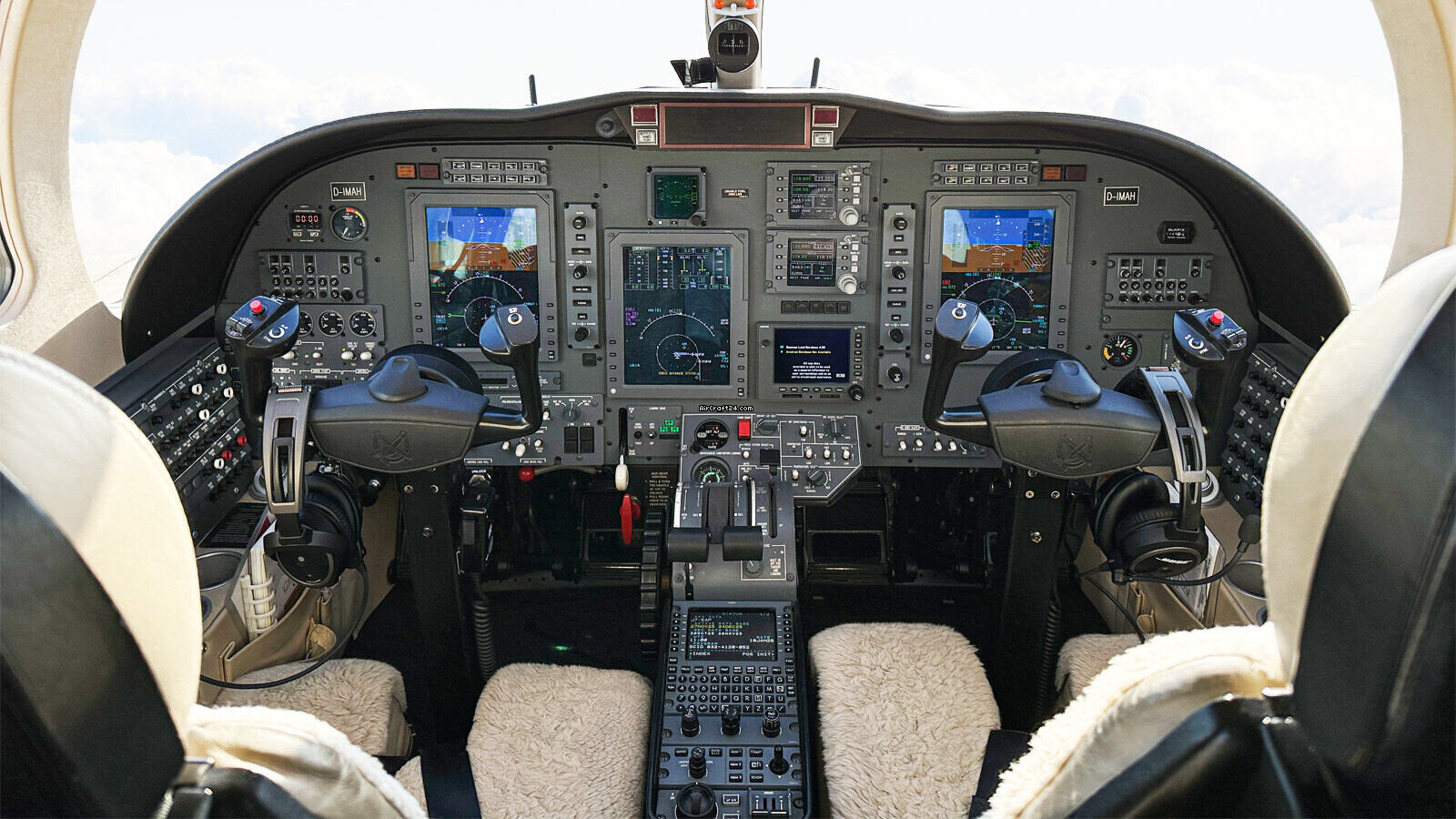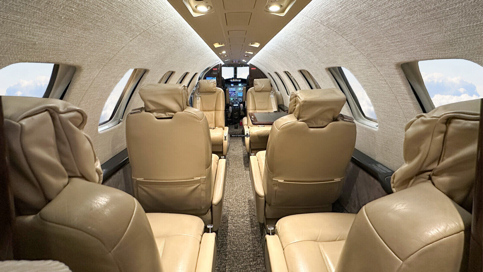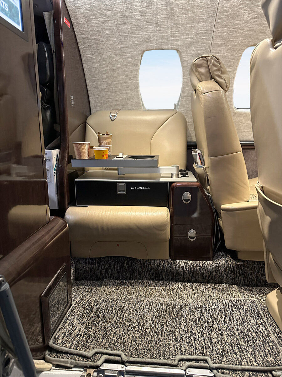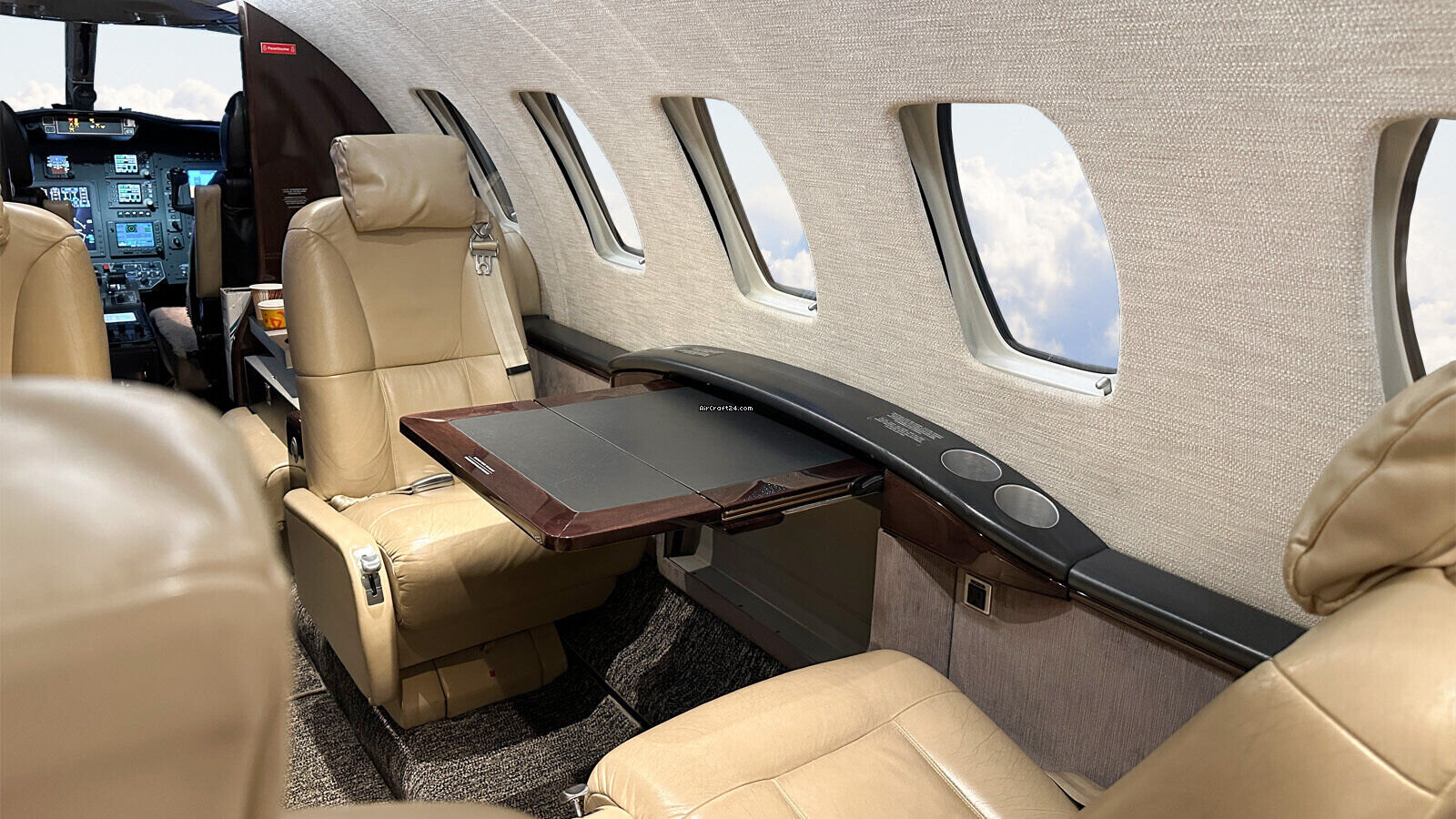 | Interior | | Six (6) passenger executive seating in beige leather (four club seating, two single fwd. facing seats), one side facing seat (7) plus belted lav seat (8), brown carpet, brown wood veneer (gloss laminate), lavatory separated by a sliding door for privacy, slim refreshment center (hot Cup), brushed aluminum hardware, Cabin information Display (AvVisor Plus), 110 V AC Cabin and Cockpit power outlets |