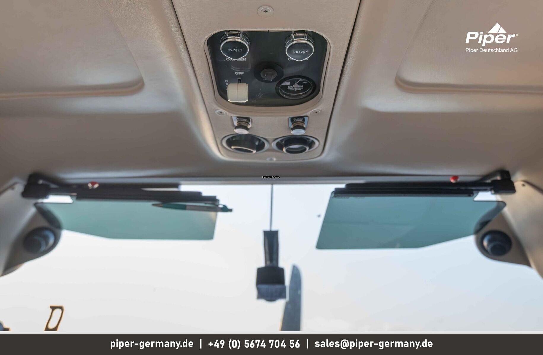 Additional features include Synthetic Vision with terrain and obstacle warning, strobe lights, and wheel fairings. For safety and convenience, the aircraft is equipped with standby instruments (horizon, airspeed, altimeter), AMSAFE inflatable seat belts, and an onboard oxygen system.