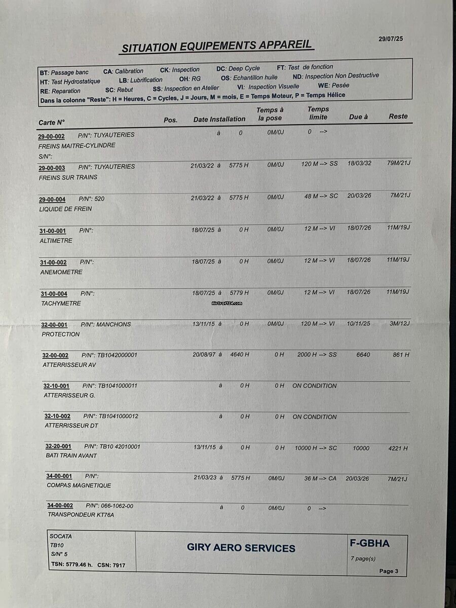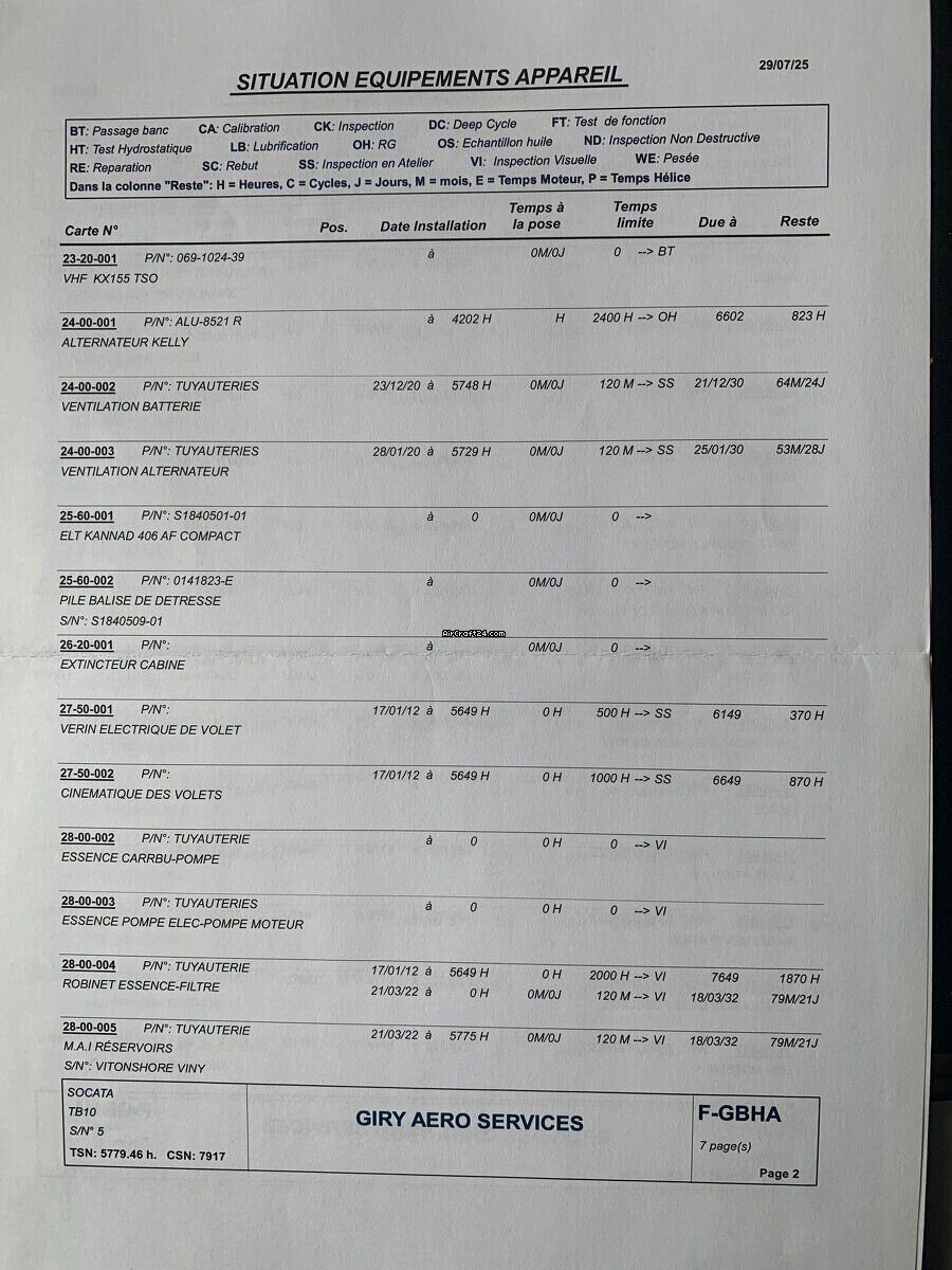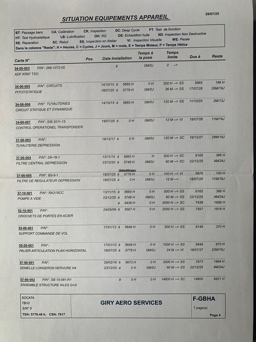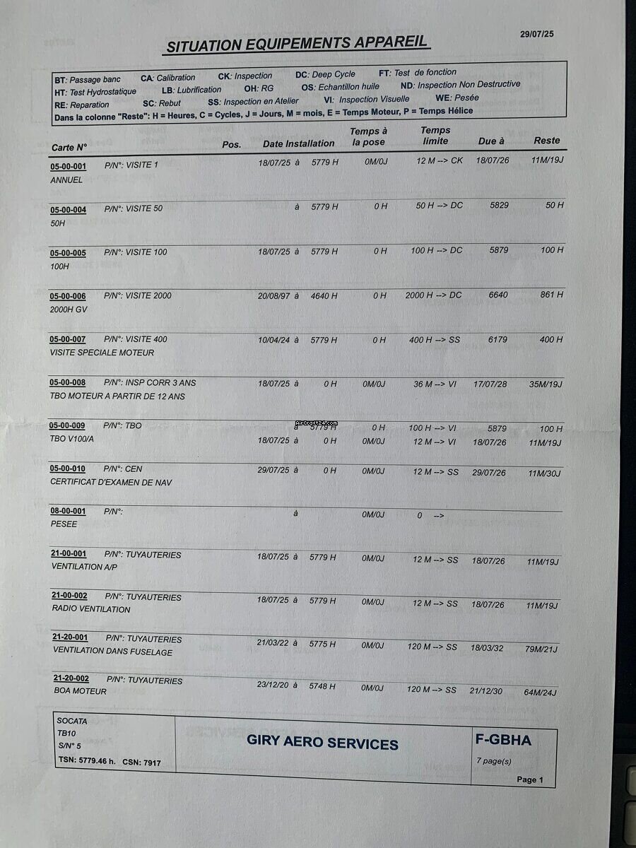 | Base data | | Type: | Single Prop | | Producent: | Eads/Socata | | Model: | TOBAGO TB 10 | | Bouwjaar: | 1978 | | Registration No.: | F-GBHA | | Serial No.: | 0005 | | Attributes: | Always hangared | | Last annual: | 5/2025 | | Location: | Frankrijk, Gueret, LFCE | | Total Time (TTAF): | 5779 h | | Prijs: | € 42.000 | | EU VAT paid: | yes | | No. of passengers: | 5 |