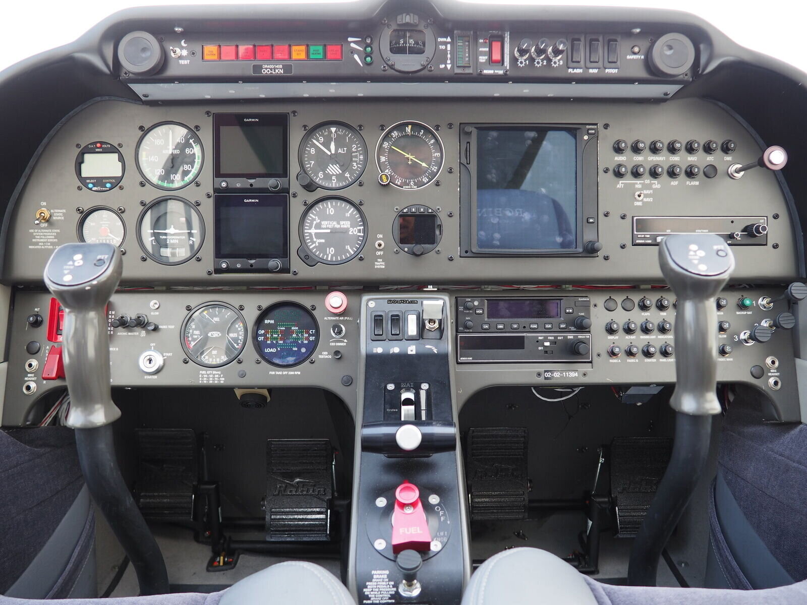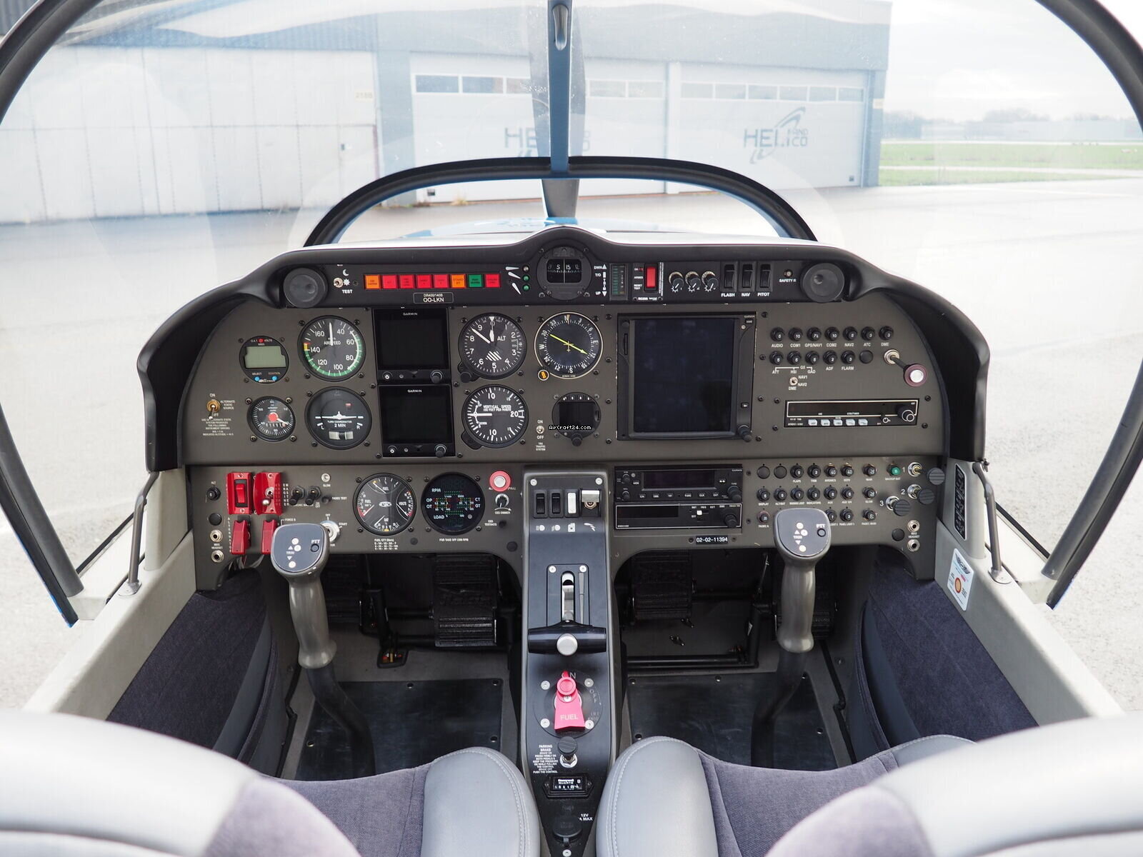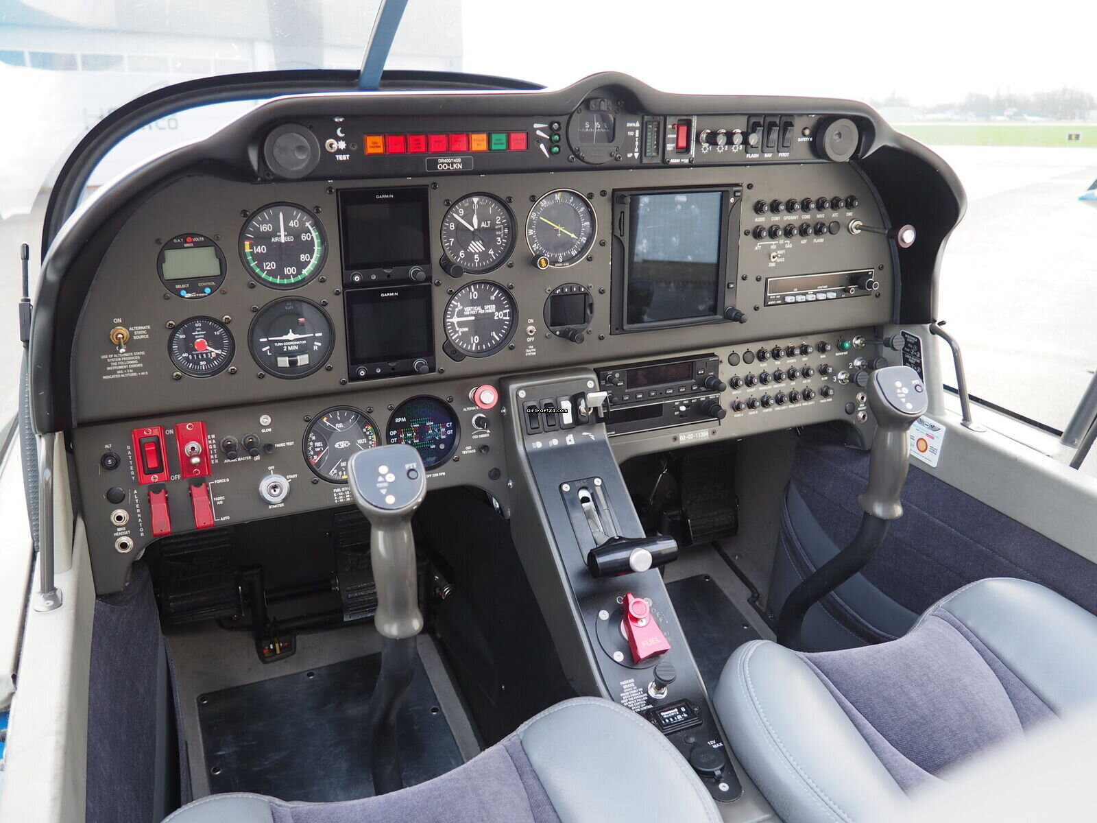 | Interior | | The cabin of this Robin DR-400 is a testament to thoughtful ergonomics and premium materials, offering a spacious four-seat configuration that ensures comfort for both pilot and passengers. The interior features a striking slate-grey and charcoal upholstery design. The seats are finished in a durable, high-quality fabric with light grey synthetic leather accents for a modern, automotive-style feel. |